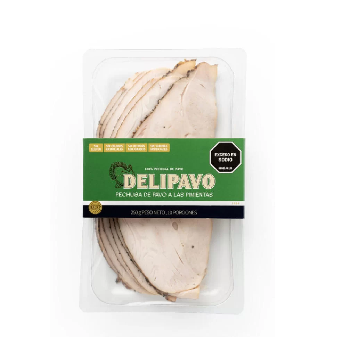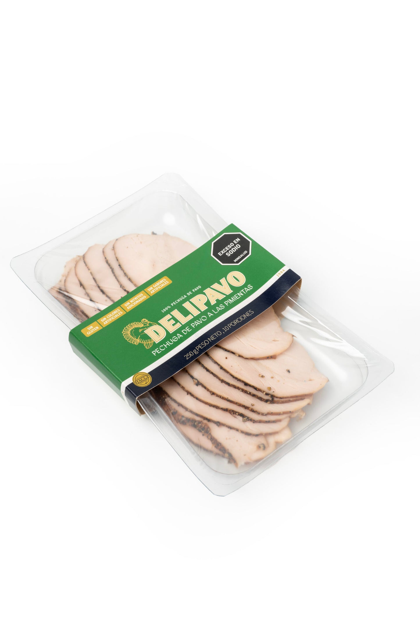 Media pechuga de pavo sin hueso y sin piel, adobada a mano, con una mezcla generosa de granos de pimienta y asada en el horno. La particular fusión de pimientas hace de esta pechuga una explosión de sabor que te encantará.