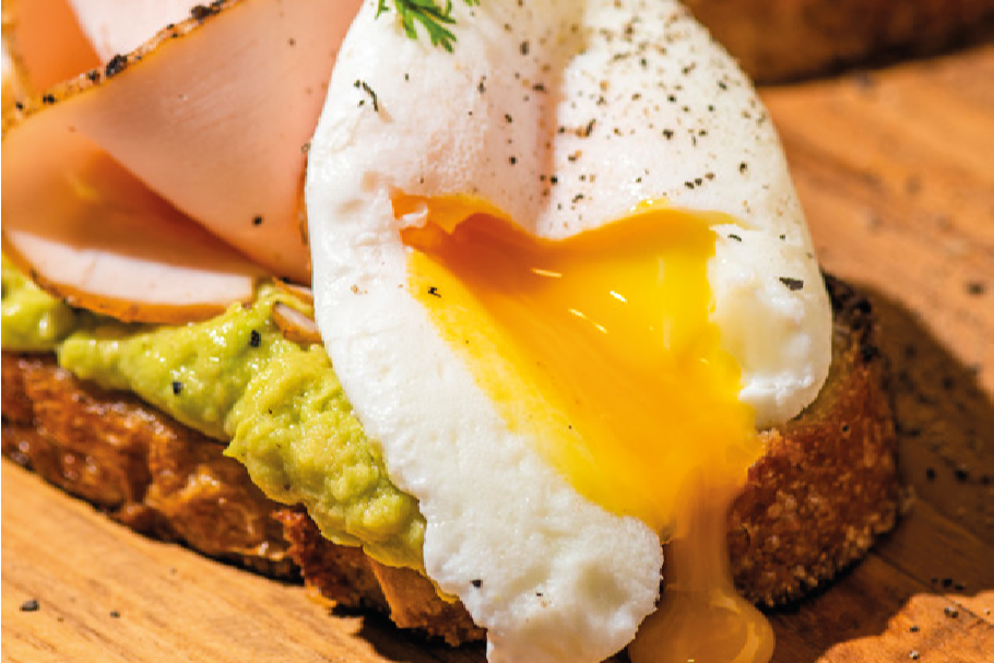 Tostada de pan de masa madre, pechuga de pavo,huevo pochado y puré hass.