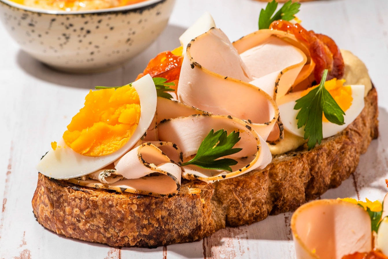 Tostada de pan de masa madre, pechuga de pavo, huevo cocido, hummus, tomate confitado.