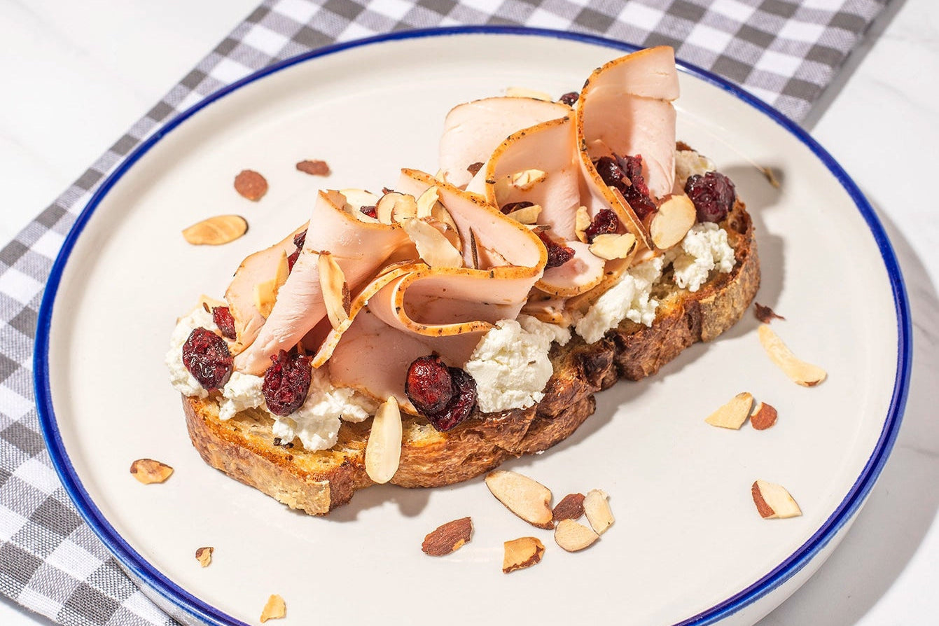 Tostada de pan de masa madre, pechuga de pavo, queso de cabra, almendras fileteadas y cranberries.